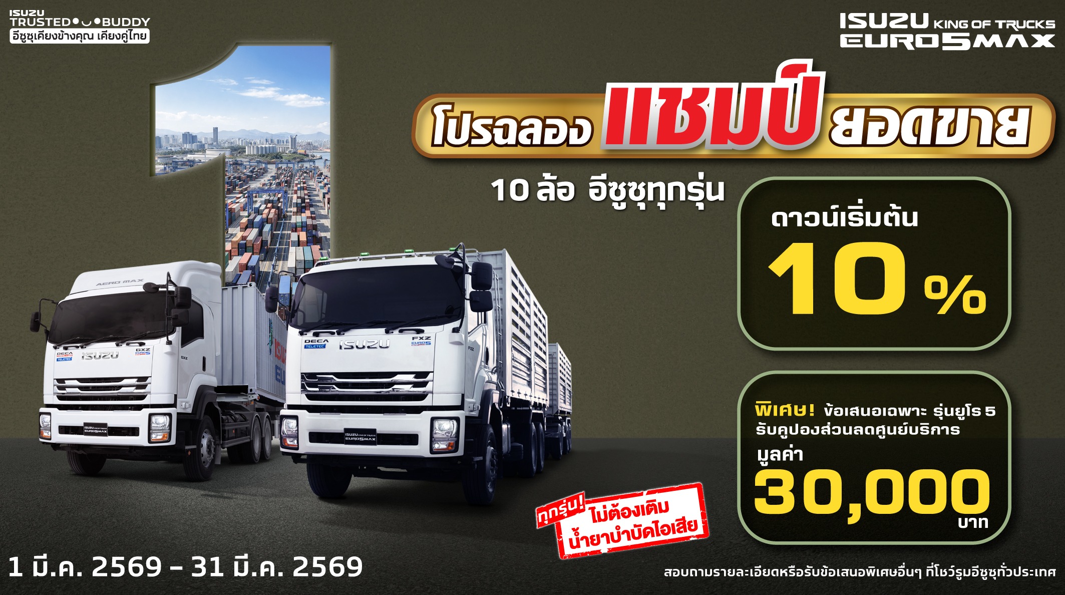 ข้อเสนอสุดพิเศษจากอีซูซุลิสซิ่ง สำหรับรถบรรทุกอีซูซุ รุ่น 10 ล้อขึ้นไปทุกรุ่น ดาวน์เริ่มต้น 0 บาท